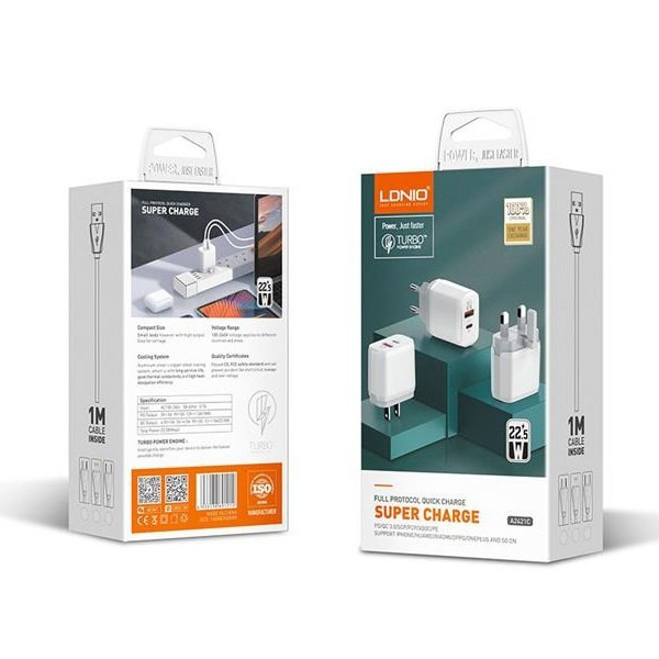 امروزه با توجه به پشتیبانی اکثر تلفن های همراه از قابلیت شارژ سریع استفاده از شارژهایی که این نوع شارژ را پشتیبانی می کند. شارژر دیواری LDNIO A2421C طراحی جمع و جوری دارد و از ماده PC نسوز با کیفیت بالا ساخته شده که در برابر فشار و شکستگی مقاوم است. این شارژ مسافرتی پروتکل های شارژ سریع را پشتیبانی می کند.این شارژر دارای یک پورت USB-A با قابلیت شارژ سریع QC 3.0 و یک پورت USB-C با قابلیت شارژ سریع PD می باشد. همچنین از پروتکل های مختلف شارژ مثل SCP، FCP و PE پشتیبانی میکند. توان شارژ آن برای خروجی تایپ C حداکثر 18w به مشخصات 4.5v=5A/9V=2A/12V=1.5A میباشد. توان شارژ خروجی USB-A حداکثر22.5W به مشخصات 4.5V=5A/5V=4.5A/9V=2A/12=1.5A میباشد. ولتاژ ورودی برای شارژر LDNIO A2421C PD QC 3.0 بین 100 تا 240 ولت است که برای استفاده در کشورهای مختلف مناسب است. شارژر LDNIO A2421C Fast Charge محافظت 9 لایه ای ارائه می دهد تا با خیال آسوده از آن استفاده کنید. در برابر توان، دما، ولتاژ،جریان و شارژ بیش از اندازه از گوشی شما محافظت می کند. همچنین جلوی اتصال کوتاه را می گیرد و جرقه نمی زند. علاوه بر این ها جنس آن از PC نسوز می باشد که تا 850 درجه سانتی گراد مقاومت دارد.داخل پک محصول یک کابل micro USB به طول یک متر قرار دارد.