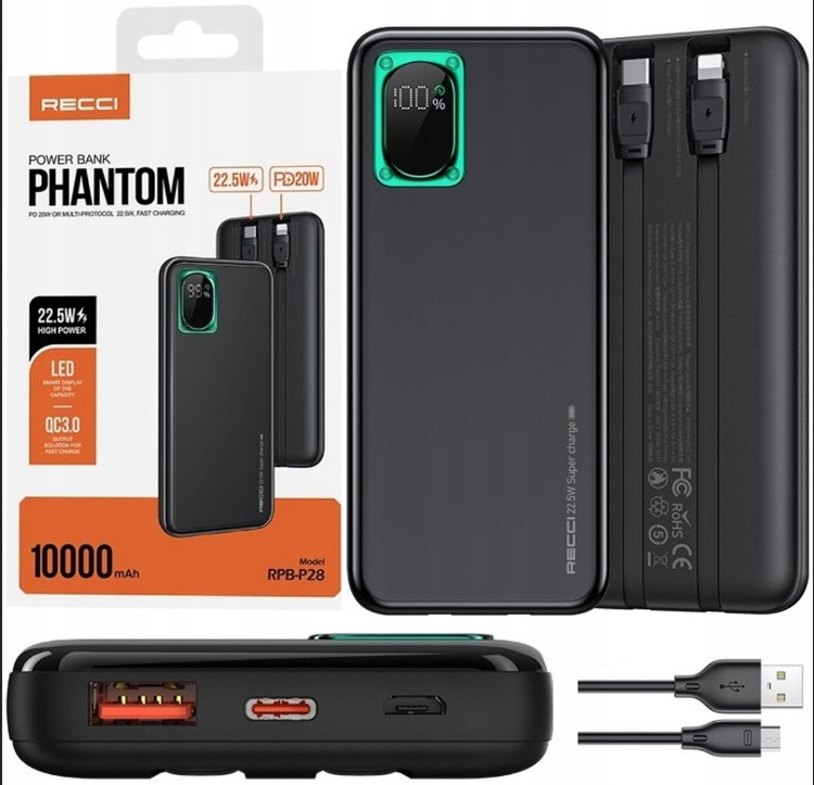 پاوربانک recci مدل RPB-P28، از سری لوازم جانبی موبایل باکیفیت از برند قدرتمند رسی ( RECCI ) می باشد. به طور کلی پاوربانک و یا همان شارژر همراه یک لوازم الکترونیکی بسیار لازم و ضرروری می باشد که کاربران می توانند دستگاه های هوشمند خود را در صورتی که پریز برق در دسترس نباشد، با استفاده از آن به راحتی شارژ کنند.