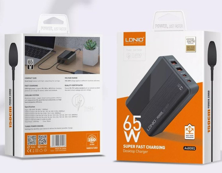 شارژر رومیزی 65وات سوپرفست شارژ الدینیو مدل A4808Q