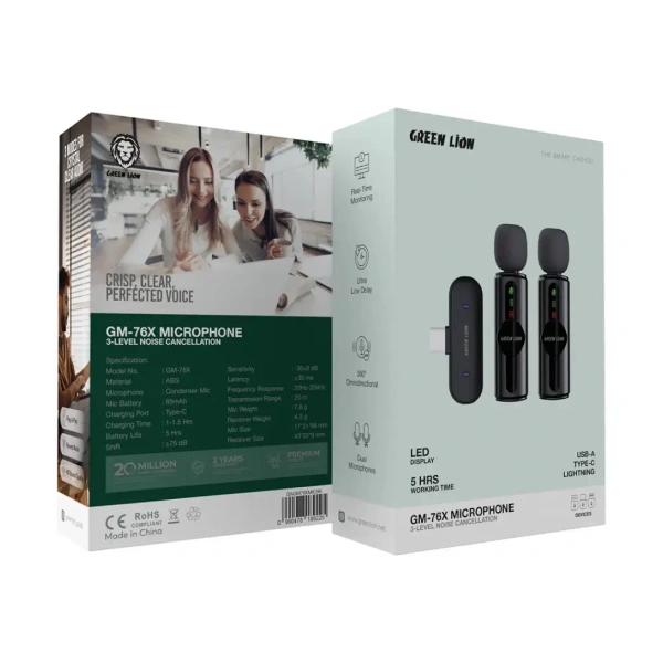 میکروفون یقه ای گرین لاین GM-76X مجهز به تکنولوژی هوشمند حذف نویز در سه سطح مختلف که صداهای مزاحم محیط مثل باد، صدای وسایل نقلیه یا شلوغی محیط را به حداقل میرساند. نتیجه؟ صدایی کاملاً شفاف و متمرکز روی صدای شما، نه محیط اطراف.